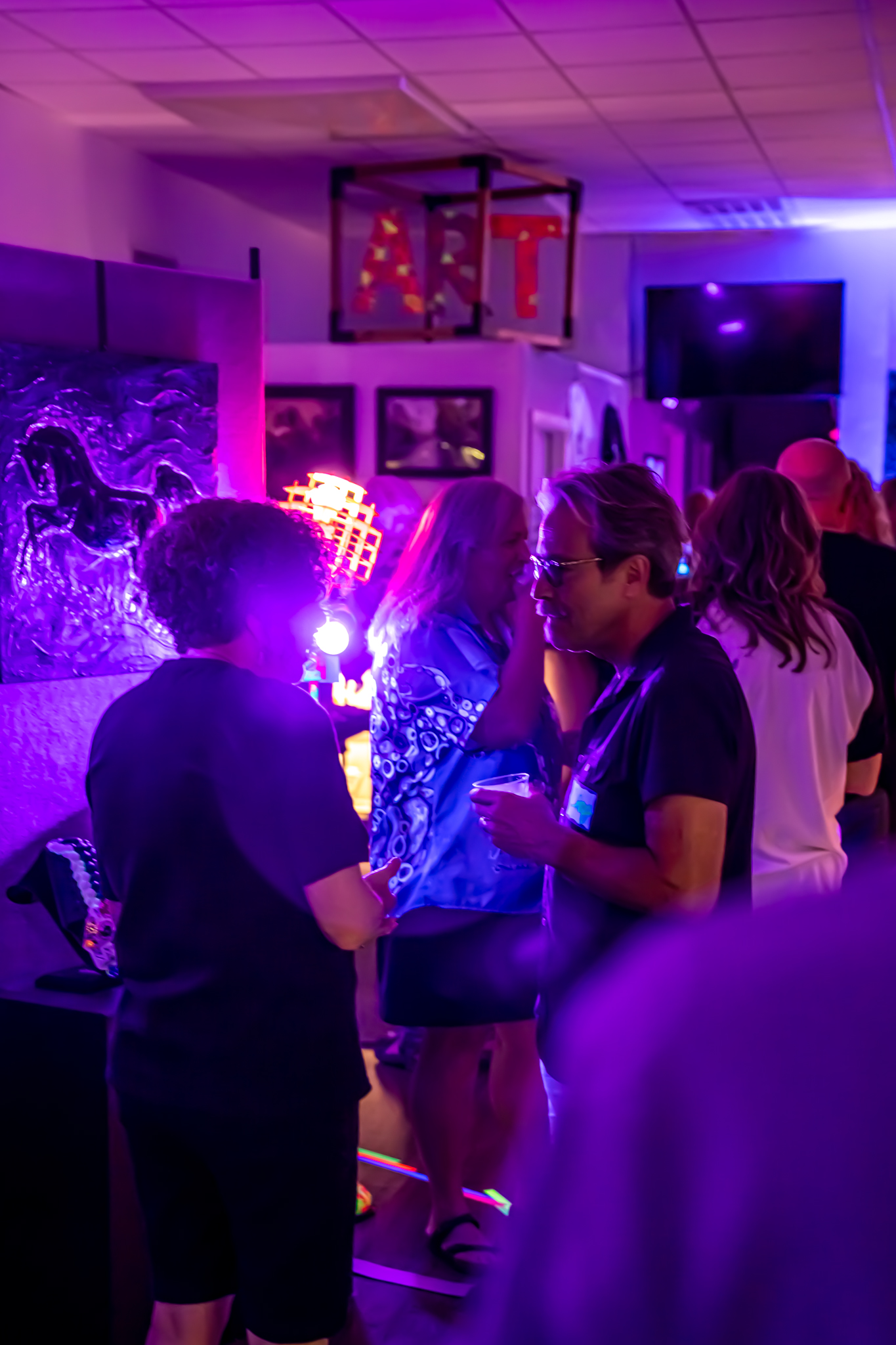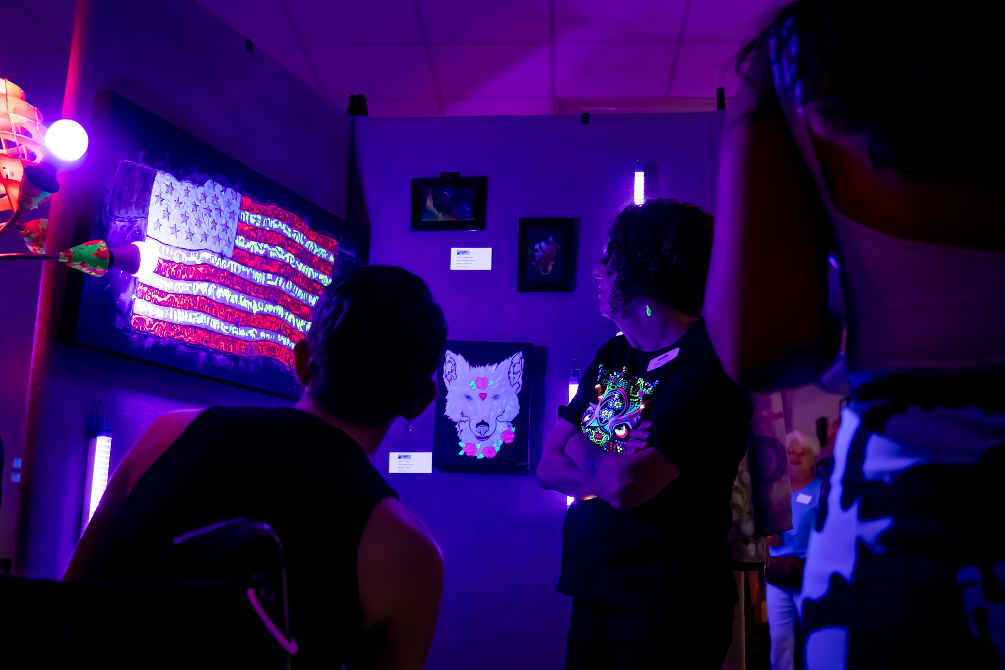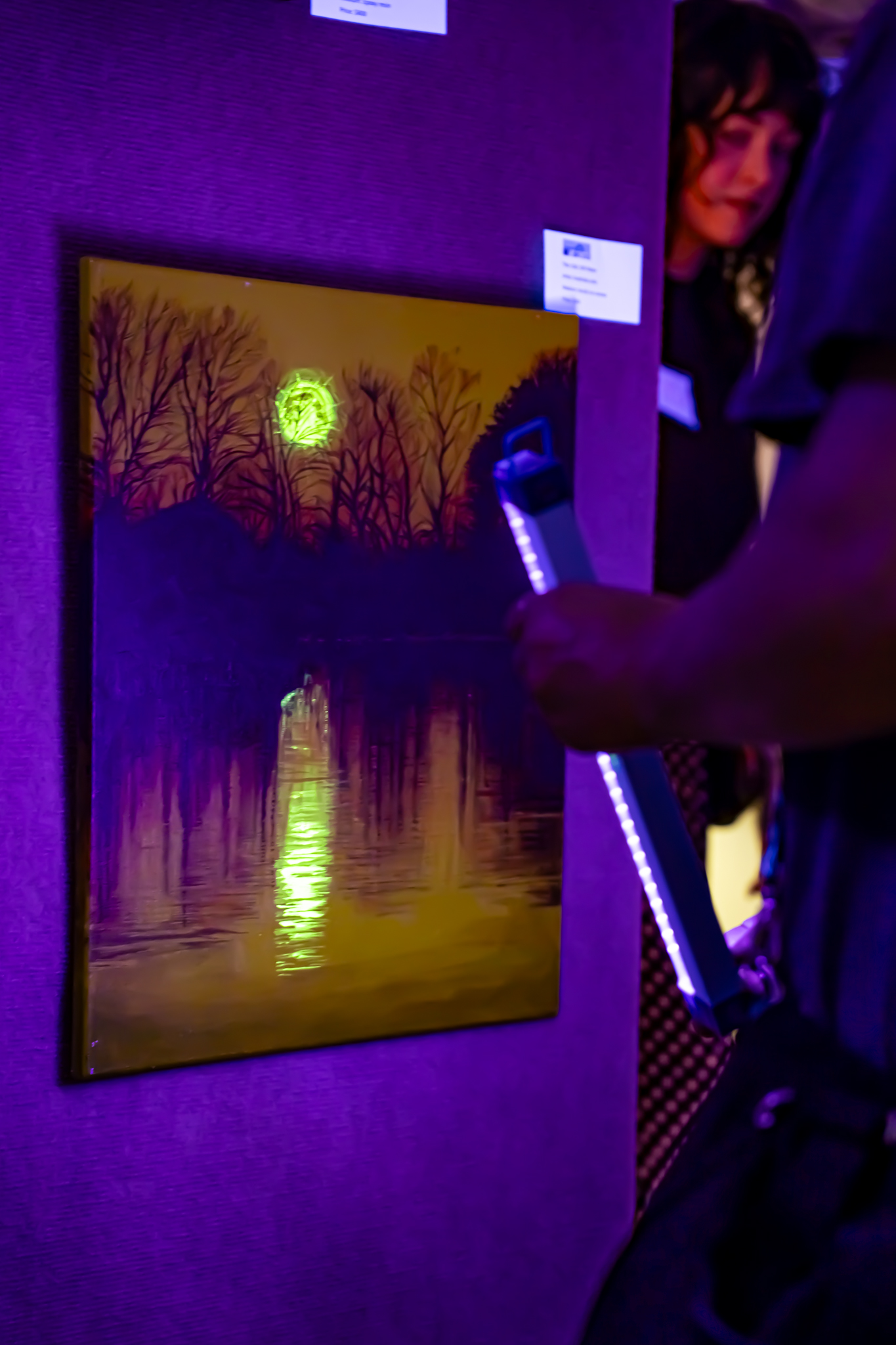 The opening reception was on Oct. 10 and was held in a darkened gallery with lots of hand held black lights, glowing face paints and a DJ pounding out electronica. The opening was interactive and engaging with a very positive buzz in the room.
