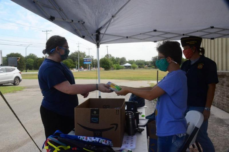 Maurice T. Suttles VFW Post 3413 and Auxiliary recently had a mask/school supply drive. Commander Stephanie Brown contacted Kristina Woody, Principal at Mendez Elementary School to see if they are in need of more supplies. VFW Post 3413 would like to thank HEB #2 store on W. Hopkins Street for donating 100 masks and ResCare Premier on W. Hutchinson for the donation of school supplies. Below, above, Megan Pena from ResCare Premier giving school supplies to Commander Stephanie Brown of VFW Post 3413, and Rowena Brown of Girl Scout Troop #1098.