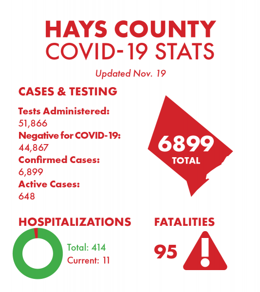 There are currently 648 active coronavirus cases — a 32-case decrease since Wednesday — and there have been 6,899 total cases since the first diagnosis of the virus within Hays County on March 14. The local health department also reported that there have been 810 active cases over the last 21 days — a 60-case increase since Wednesday. The county reported that there have been 833 probable cases spanning from April through early November.