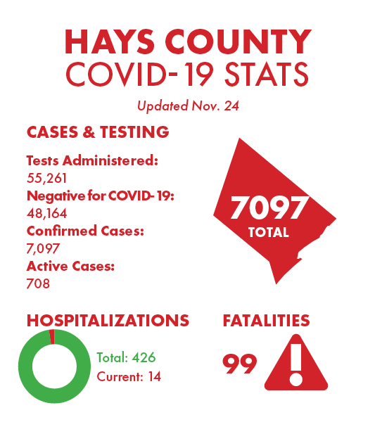 There are currently 708 active coronavirus cases — a 27-case decrease since Monday — and there have been 7,097 total cases since the first diagnosis of the virus within Hays County on March 14. The local health department also reported that there have been 945 active cases over the last 21 days — an 11-case increase since Monday. The county reported that there have been 866 probable cases spanning from April through mid November.