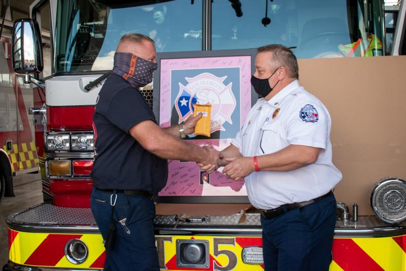 Above, San Marcos Fire Chief Les Stephens presents the funds raised for breast cancer awareness.