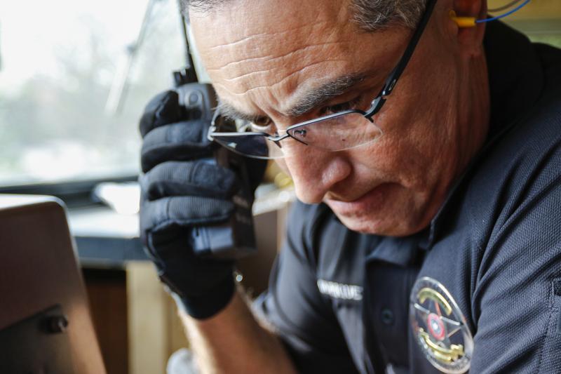 Senior Special Agent Alfredo Rodriguez listens to officers on the ground from inside the train’s cab as San Marcos Police and railroad officers were on the lookout for violations.