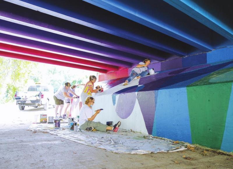During the construction of the San Marcos Shared-Use Path Trail Project, a significant amount of graffiti was discovered underneath the Cheatham Street bridge. In order to remedy this issue, Community Enhancement Initiatives Manager Amy Thomaides and Innovation Manager Charlotte Wattigny designed the Kaleidoscope No. 19 mural to be painted on the underside of the bridge. The name is a nod to the 19 separate colors used within the mural.