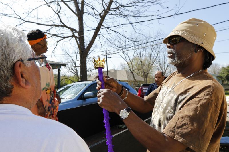 Richard Harris double-checks that the crown on the staff is straight as the group decorates and prepares their float.