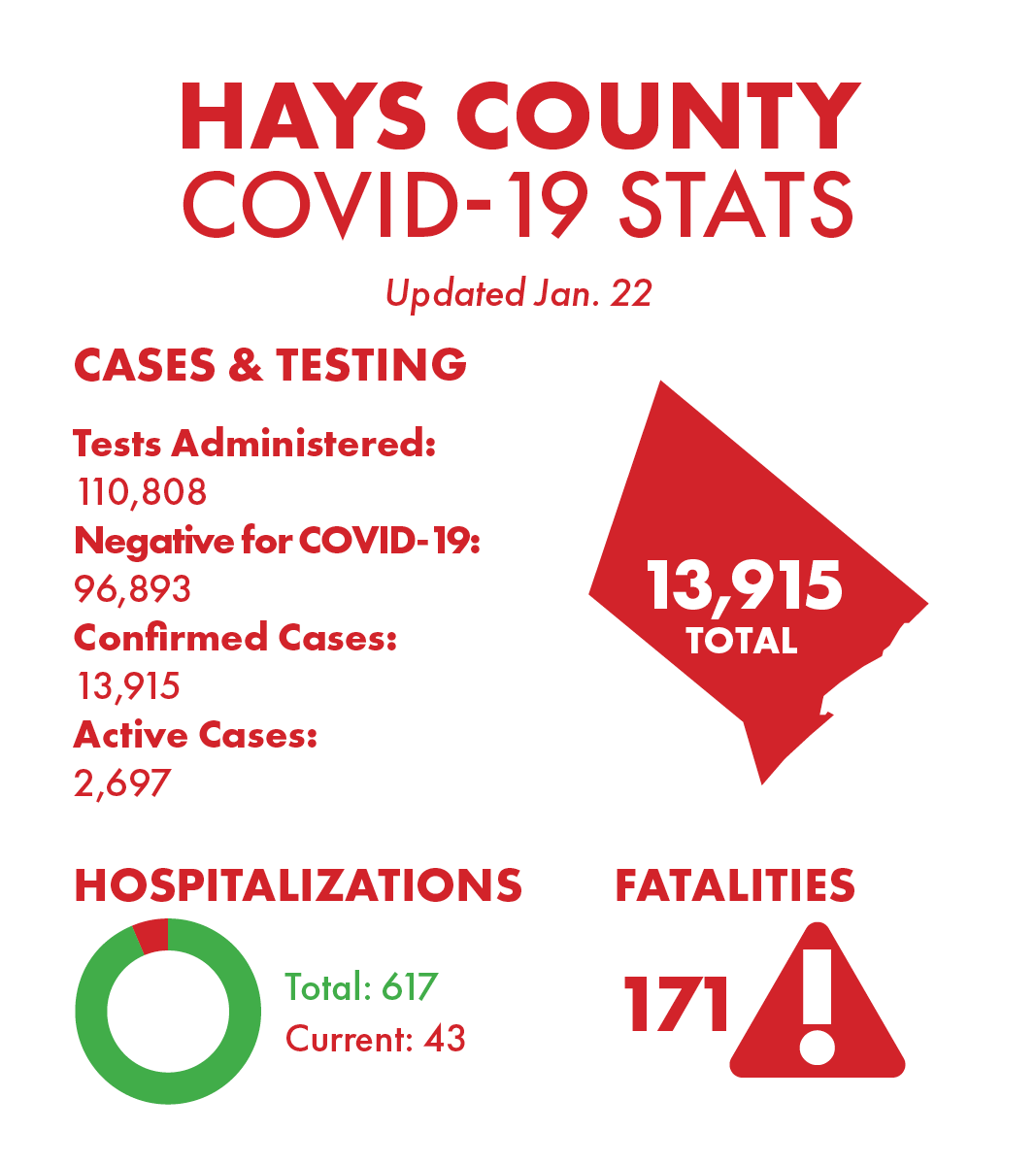 There are currently 43 county residents hospitalized by COVID-19 and there have been 660 total hospitalizations as of Friday. Some patients hospitalized by COVID-19 are in hospitals outside of Hays County but are included in the county’s numbers if they reside within Hays County, the local health department said.