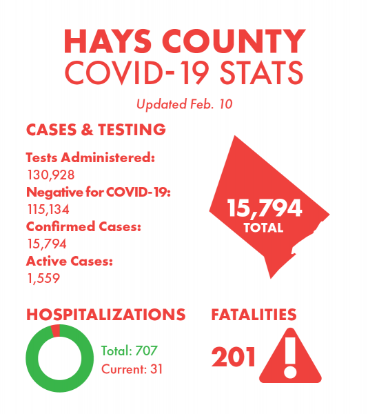The county stated that 1,559 COVID-19 cases are considered active — a 73-case decrease since Tuesday — and there have been 15,794 total cases since the first diagnosis of the virus within Hays County on March 14, 2020. There have been 2,614 active cases over the last 21 days as of Wednesday. The county stated that there have been 1,759 probable cases spanning from April 2020 through Feb. 10, 2021.