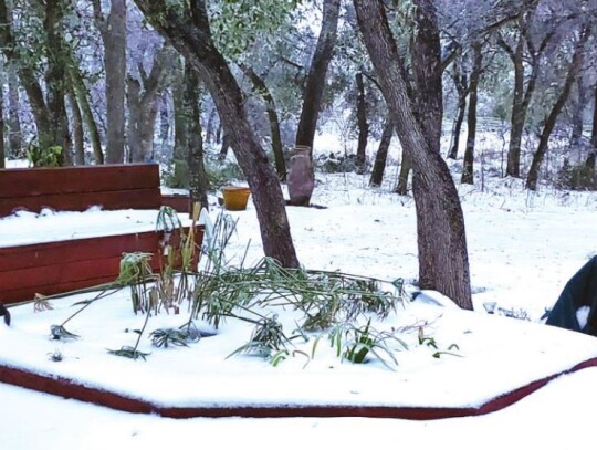 Smaller miracles occurred in other yards after the freeze. Nancy Rodriguez’s photo shows a young lettuce plant continuing to grow after being protected by a blanket of snow. Cynthia Gonzales shared an image of new shoots of society garlic sprouting from yellowed remains of frozen leaves. And Maggie Reagan’s before-and-after photos of a frozen pond in her snow-covered yard prove that the calla lilies not only survived but are ready to bloom.