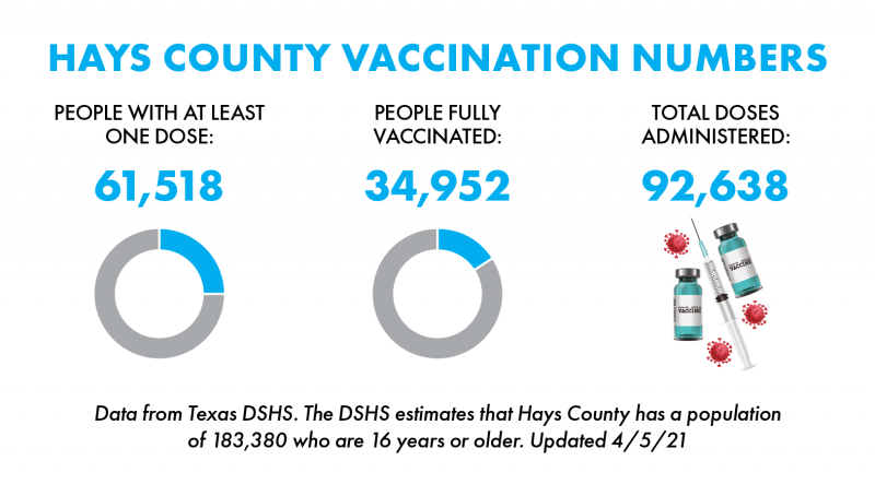 To pre-register for Hays County’s COVID-19 vaccine waitlist visit haysinformed.com/covid-19. The pre-registration list does not guarantee an appointment. The state is allowing all adults to sign up to receive a COVID-19 vaccine, which went into effect Monday. According to the DSHS, 57,291 county residents have received at least one dose of a COVID-19 vaccine as of Monday, while 31,252 have been fully vaccinated, approximately 17.04% of eligible adults. The DSHS estimates that Hays County has a population of 183,380 who are 16 years or older.