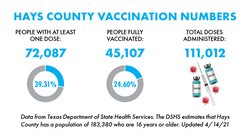 To pre-register for Hays County’s COVID-19 vaccine waitlist visit haysinformed.com/covid-19. The pre-registration list does not guarantee an appointment. The state is allowing all adults to sign up to receive a COVID-19 vaccine effective March 29. According to the DSHS, 72,087 county residents have received at least one dose of a COVID-19 vaccine as of Wednesday, while 45,107 have been fully vaccinated. The DSHS estimates that Hays County has a population of 183,380 who are 16 years or older.