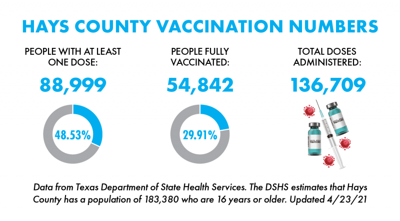 To make an appointment for a vaccine shot, visit https://www.haysinformed.com. From there you can use the new online scheduler to find a time and location that works best for you. The state is allowing all adults to sign up to receive a COVID-19 vaccine effective March 29. According to the DSHS, 88,999 county residents have received at least one dose of a COVID-19 vaccine as of Friday, while 54,842 have been fully vaccinated. The DSHS estimates that Hays County has a population of 183,380 who are 16 years or older.