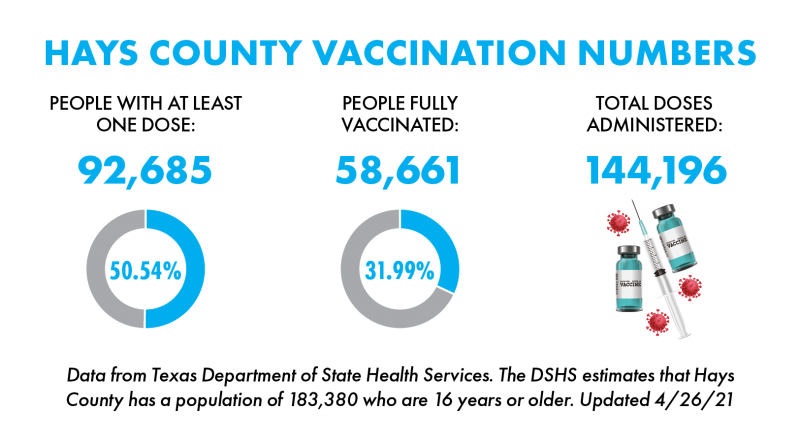 To make an appointment for a vaccine shot, visit https://www.haysinformed.com. From there you can use the new online scheduler to find a time and location that works best for you. The state is allowing all adults to sign up to receive a COVID-19 vaccine effective March 29. According to the DSHS, 92,685 county residents have received at least one dose of a COVID-19 vaccine as of Monday, while 58,661 have been fully vaccinated. The DSHS estimates that Hays County has a population of 183,380 who are 16 years or older.