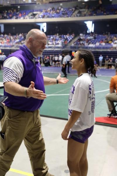 The day of the tournament started off like normal. They weighed in, took a nap, warmed up and listened to music. Kaylynn won her first match, but she still had nerves afterwards. She had to face the No. 1-ranked girl in her weight class, junior Eliana Martinez from Allen, in the second match. Kaylynn was defeated, but she didn’t get pinned — something no one else in her weight class was able to accomplish.