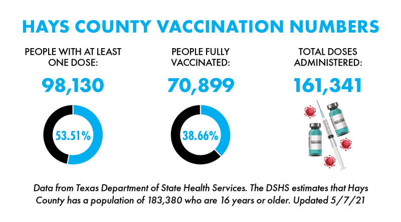 To make an appointment for a vaccine shot, visit https://www.haysinformed.com. From there you can use the new online scheduler to find a time and location that works best for you. The state is allowing all adults to sign up to receive a COVID-19 vaccine effective March 29. According to the DSHS, 98,130 county residents have received at least one dose of a COVID-19 vaccine at the time of publication, while 70,899 have been fully vaccinated. The DSHS estimates that Hays County has a population of 183,380 who are 16 years or older.