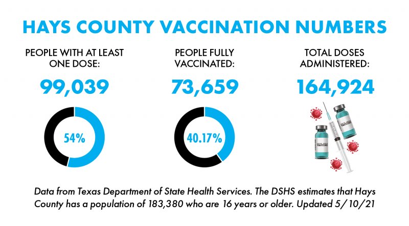 To make an appointment for a vaccine shot, visit https://www.haysinformed.com. From there you can use the new online scheduler to find a time and location that works best for you. The state is allowing all adults to sign up to receive a COVID-19 vaccine effective March 29. According to the DSHS, 99,039 county residents have received at least one dose of a COVID-19 vaccine at the time of publication, while 73,659 have been fully vaccinated. The DSHS estimates that Hays County has a population of 183,380 who are 16 years or older.