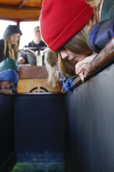 Indigo Kovac peers through the glass bottom of a boat during the group’s Spring Lake tour.