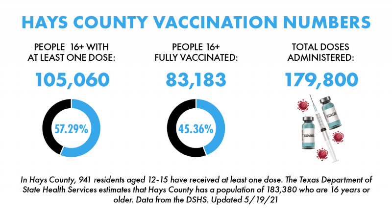 To make an appointment for a vaccine shot, visit https://www.haysinformed.com. From there you can use the new online scheduler to find a time and location that works best for you. According to the DSHS, 83,183 Hays County citizens have been fully vaccinated, approximately 45.33% of 183,380 eligible residents who are 16 years or older. Additionally, 105,060 county residents have received at least one COVID-19 vaccine dose — 57.29%. Although 12-15 year olds have been approved to receive a Pfizer vaccine, the DSHS has not yet factored that age range into its eligible population. The DSHS states that 941 Hays County adolescents between 12-15 have received a Pfizer vaccine dose.