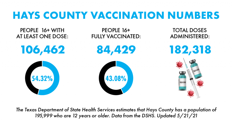 To make an appointment for a vaccine shot, visit https://www.haysinformed.com. From there you can use the new online scheduler to find a time and location that works best for you. According to the DSHS, 84,429 Hays County citizens have been fully vaccinated, approximately 43.07% of 195,999 eligible residents who are 12 years or older. Additionally, 106,462 county residents have received at least one COVID-19 vaccine dose — 54.31%.