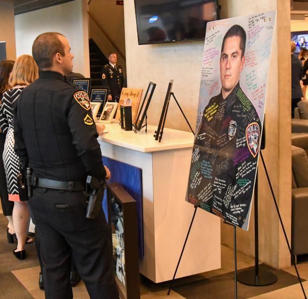 Above, a member of the San Marcos Police Department looks at table full of photos remembering Officer Justin Putnam's life. Daily Record photo by Lance Winter