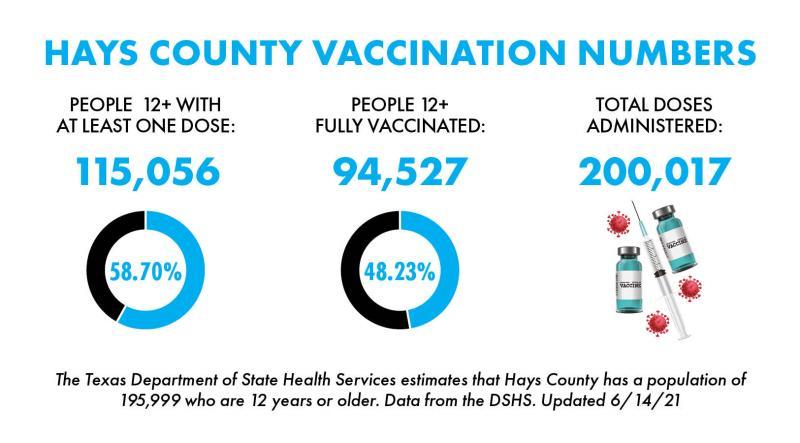 To make an appointment for a vaccine shot, visit https://www.haysinformed.com. From there you can use the new online scheduler to find a time and location that works best for you. According to the DSHS, 94,527 Hays County residents have been fully vaccinated, approximately 48.23% of 195,999 eligible residents who are 12 years or older. Additionally, 115,056 county residents have received at least one COVID-19 vaccine dose — 58.7%.