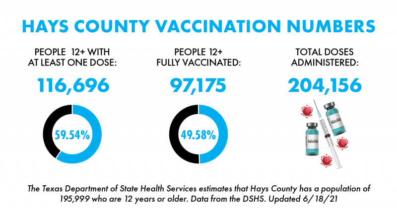 To make an appointment for a vaccine shot, visit https://www.haysinformed.com. From there you can use the new online scheduler to find a time and location that works best for you. According to the DSHS, 97,175 Hays County residents have been fully vaccinated, approximately 49.58% of 195,999 eligible residents who are 12 years or older. Additionally, 116,696 county residents have received at least one COVID-19 vaccine dose — 59.54%.