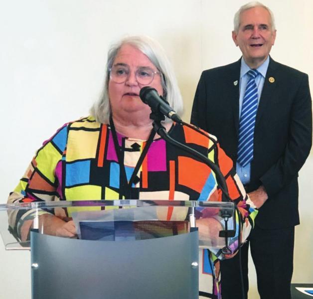 Above, San Marcos Public Library Director Diane Insley speaks to a crowd at the library dedication ceremony celebrating the completion of the expansion and remodel project. Behind her, U.S. Rep. Lloyd Doggett overlooks the crowd. Daily Record photo by Lance Winter