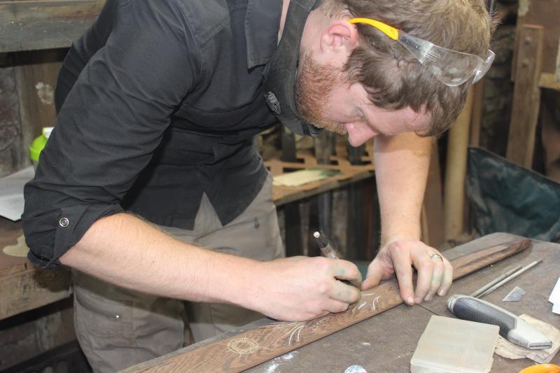 A lot of creativity goes into each design. One former employee was a drummer and fashioned a sword guard out of one of his old cymbals. Many of the blades feature complicated etchings that are hand drawn on the steel and then dipped in acid leaving the design imprinted on the blade.