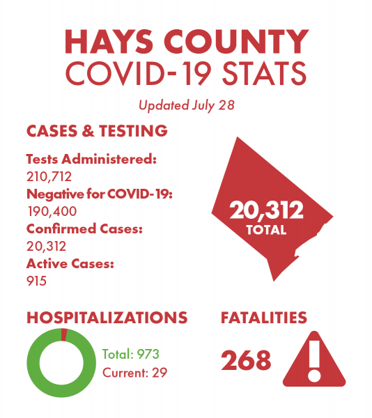 The county considers 915 cases active — 200 more than Monday. Hays County’s active case count has risen from 177 on July 2 to the 915 tallied on Wednesday. There have been 20,312 total cases since the first diagnosis of the virus within its boundaries on March 14, 2020. Hays County has tallied 1,128 COVID-19 cases over the past 21 days. There have been 2,262 probable cases spanning from April 2020 through July 28, 2021.