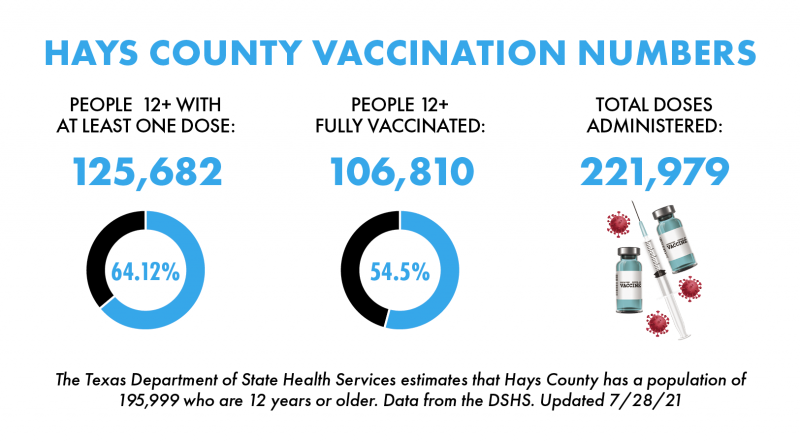 To make an appointment for a vaccine shot, visit https://www.haysinformed.com. From there you can use the new online scheduler to find a time and location that works best for you. According to the DSHS, 106,810 Hays County residents have been fully vaccinated against COVID-19 as of Wednesday, approximately 54.45% of 195,999 eligible residents who are 12 years or older.