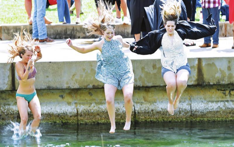 Above, a trio of friends — Julie Villarreal, Shannon Grinnell and Ashley Cashel — take part in the traditional celebratory jump into the San Marcos River.