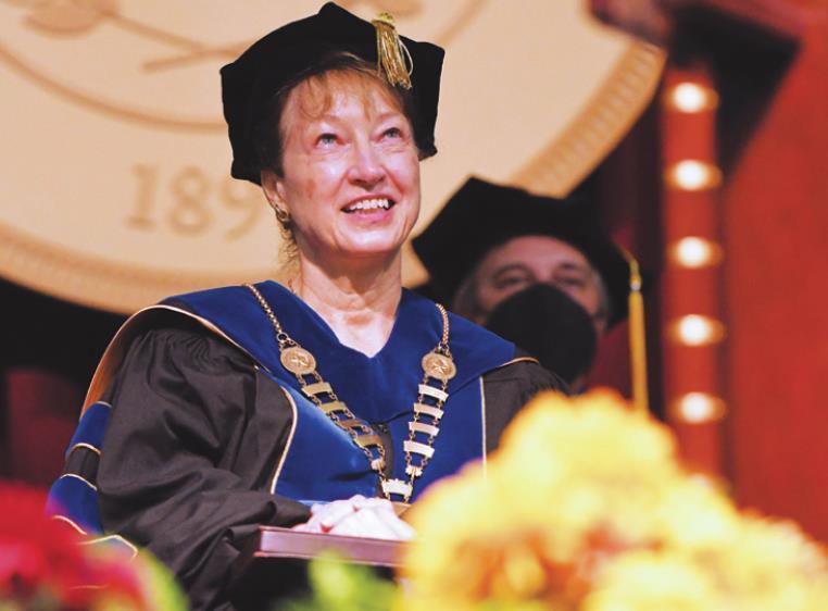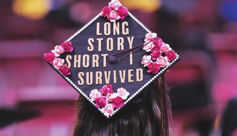 A graduate’s mortarboard reads “Long story short, I survived.”