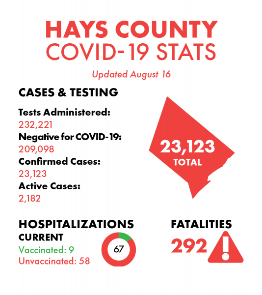 The county considers 2,182 cases active — 37 fewer than Friday — and there have been 23,123 total cases since the first diagnosis of the virus within its boundaries on March 14, 2020. Hays County has tallied 3,095 COVID-19 cases over the past 21 days. There have been 2,573 probable cases spanning from April 2020 through Aug. 16, 2021.