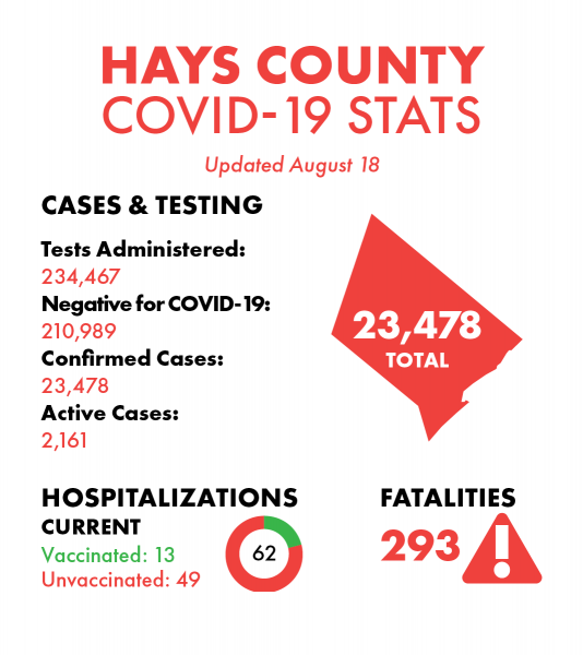 Hays County considers 2,161 cases active — 24 more than Tuesday — and there have been 23,478 total cases since the first diagnosis of the virus within its boundaries on March 14, 2020. Hays County has tallied 3,194 COVID-19 cases over the past 21 days. There have been 2,659 probable cases spanning from April 2020 through Aug. 18, 2021.