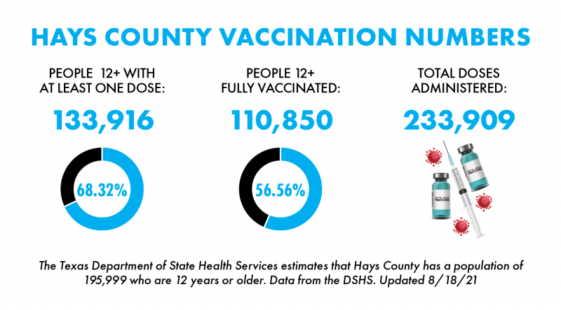 To make an appointment for a vaccine shot, visit https://www.haysinformed.com. From there you can use the new online scheduler to find a time and location that works best for you. According to the DSHS, 110,850 Hays County residents have been fully vaccinated against COVID-19 as of Friday, approximately 56.56% of 195,999 eligible residents who are 12 years or older. Additionally, 133,916 county residents have received at least one COVID-19 vaccine dose — 68.32% of the eligible population.