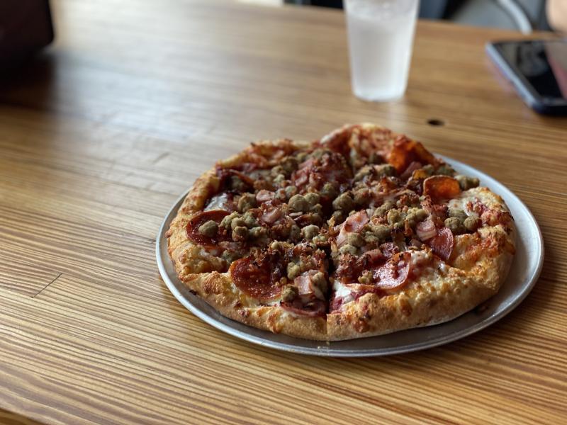 My partner, not much of a vegetable eater, opted for the Meat Almighty for just a dollar more. It came with a red sauce base as well and topped with pepperoni, sage sausage, ground beef, pit smoked ham and bacon for $9.95. Yikes. Might need to check his cholesterol later.