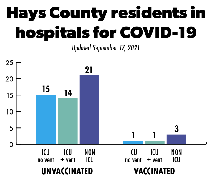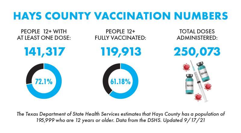To make an appointment for a vaccine shot, visit https://www.haysinformed.com. From there you can use the new online scheduler to find a time and location that works best for you. According to the DSHS, 119,913 Hays County residents have been fully vaccinated against COVID-19 as of Friday, approximately 61.18%% of 195,999 eligible residents who are 12 years or older. Additionally, 141,317 county residents have received at least one COVID-19 vaccine dose — 72.1% of the eligible population.
