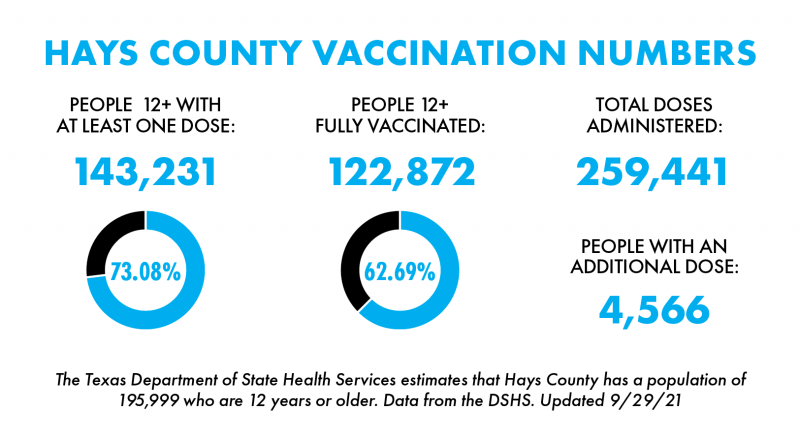 To make an appointment for a vaccine shot, visit https://www.haysinformed.com. From there you can use the new online scheduler to find a time and location that works best for you. According to the DSHS, 122,872 Hays County residents have been fully vaccinated against COVID-19 as of Friday, approximately 62.69% of 195,999 eligible residents who are 12 years or older. Additionally, 143,231 county residents have received at least one COVID-19 vaccine dose — 73.08% of the eligible population.