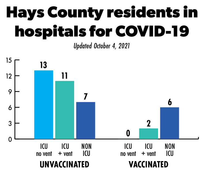 To make an appointment for a vaccine shot, visit https://www.haysinformed.com. From there you can use the new online scheduler to find a time and location that works best for you. According to the DSHS, 123,778 Hays County residents have been fully vaccinated against COVID-19 as of Monday, approximately 63.15% of 195,999 eligible residents who are 12 years or older. Additionally, 143,921 county residents have received at least one COVID-19 vaccine dose — 73.2% of the eligible population. DSHS data states that 5,041 county residents have received a COVID-19 booster shot.