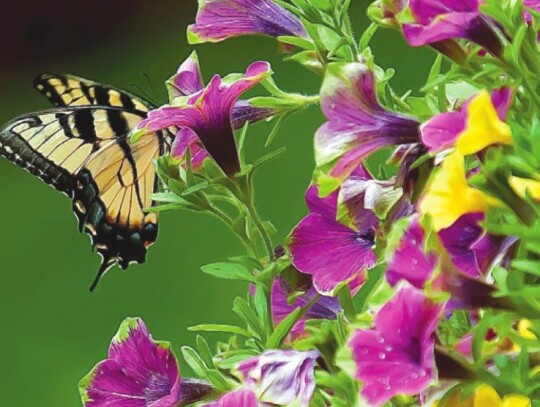 Like the other Supertunias I was growing, Picasso in Purple surprised me with frequent visits of the yellow Eastern Tiger Swallowtail butterfly. It was like nature was doing its part to enhance the color scheme. So it is déjà vu, as I have planted the partnerships again in the bamboo container.