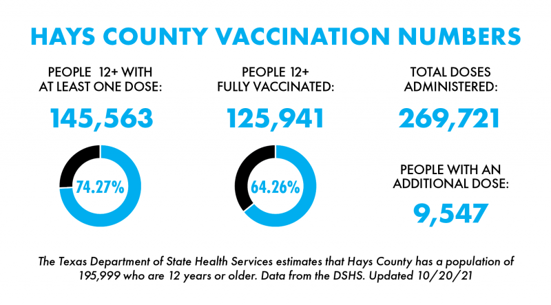 To make an appointment for a vaccine shot, visit https://www.haysinformed.com. From there you can use the new online scheduler to find a time and location that works best for you. According to the DSHS, 125,941 Hays County residents have been fully vaccinated against COVID-19 as of Friday, approximately 64.26% of 195,999 eligible residents who are 12 years or older.