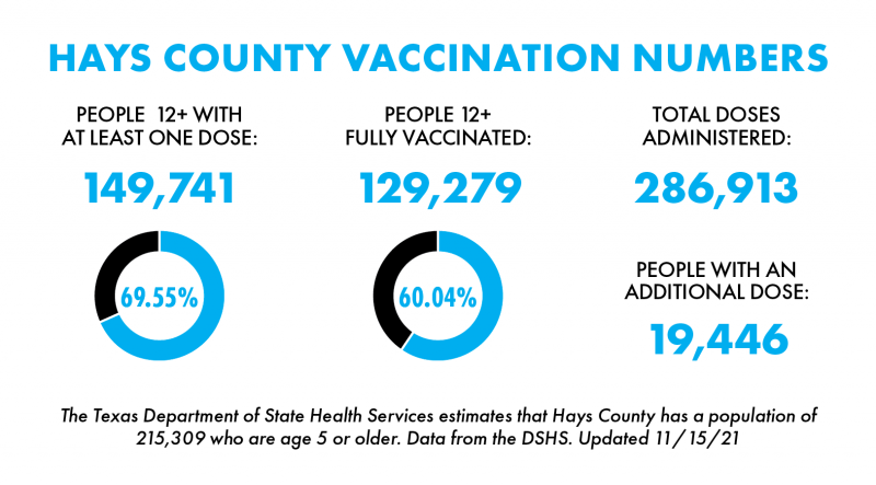 To make an appointment for a vaccine shot, visit https://www.haysinformed.com. From there you can use the new online scheduler to find a time and location that works best for you. According to the DSHS, 129,279 Hays County residents have been fully vaccinated against COVID-19 as of Monday, approximately 60.04% of 215,309 eligible residents who are 5 years or older.