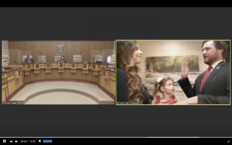 Above, newly elected Councilmember Jude Prather is sworn into office virtually by his wife Kathy Martinez-Prather on Monday. Screenshot via city council video