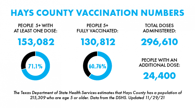 To make an appointment for a vaccine shot, visit https://www.haysinformed.com. From there you can use the new online scheduler to find a time and location that works best for you. According to the DSHS, 130,812 Hays County residents have been fully vaccinated against COVID-19 as of Monday, approximately 60.76% of 215,309 eligible residents who are 5 years or older.
