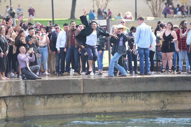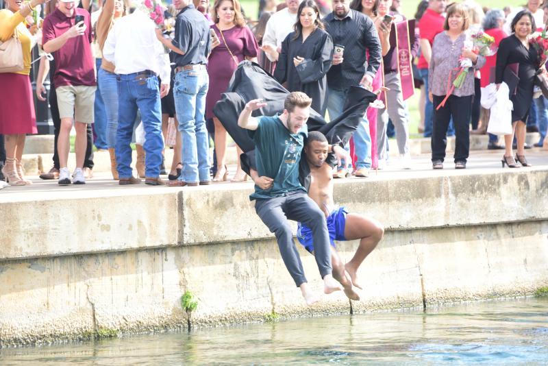 Pictured, Texas State University graduates celebrate following one of Friday's commencement ceremonies by taking part in the traditional splash into the San Marcos River. More than 2,900 students were candidates for undergraduate and graduate degrees this fall. The university hosted six ceremonies separated between Friday and Saturday. Daily Record photos by Gerald Castillo