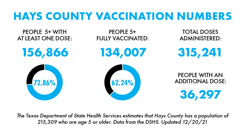 According to the DSHS, 134,007 Hays County residents have been fully vaccinated against COVID-19 as of Monday, approximately 62.24% of 215,309 eligible residents who are 5 years or older. Additionally, 156,866 county residents have received at least one COVID-19 vaccine dose — 72.86% of the eligible population. DSHS data states that 36,297 county residents have received a COVID-19 booster shot.
