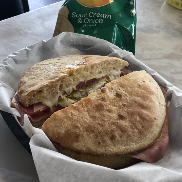 On the day of our visit, I chose the “Salvation” sandwich, the original creation of Alvin Ord Johnston. It came on warm French bread — made fresh — that day. Between the slices was cheddar, mozzarella, and parmesan cheeses toasted and stuffed with ham, salami, and spiced luncheon meat. It was dressed with lettuce, tomatoes, onions, and mustard. For $5.50 it’s a deal. Throw in some chips and a regular soda and it’s still a deal.