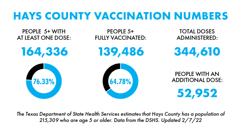 According to the DSHS, 139,486 county residents are considered fully vaccinated — 64.78% of 215,309 eligible residents who are 5 years or older as of Monday. The DSHS stated that 164,336 Hays County residents have received at least one COVID-19 vaccination dose — 76.33% of eligible residents. Additionally, the DSHS stated that 52,952 Hays County citizens have received an additional vaccine dose as of Monday.