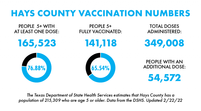 According to the DSHS, 141,118 county residents are considered fully vaccinated — 65.54% of 215,309 eligible residents who are 5 years or older as of Tuesday. The DSHS stated that 165,523 Hays County residents have received at least one COVID-19 vaccination dose — 76.788% of eligible residents. Additionally, the DSHS stated that 54,572 Hays County citizens have received an additional vaccine dose as of Tuesday.