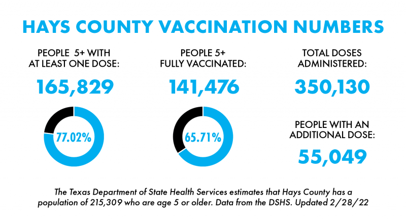 According to the DSHS, 141,476 county residents are considered fully vaccinated — 65.71% of 215,309 eligible residents who are 5 years or older as of Monday. The DSHS stated that 165,829 Hays County residents have received at least one COVID-19 vaccination dose — 77.02% of eligible residents. Additionally, the DSHS stated that 55,049 Hays County citizens have received an additional vaccine dose as of Monday.