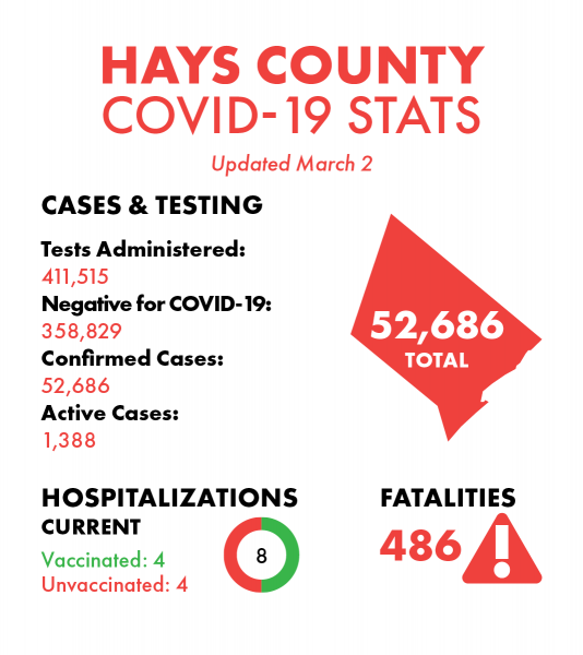 According to the DSHS, 141,606 county residents are considered fully vaccinated — 65.77% of 215,309 eligible residents who are 5 years or older as of Wednesday. The DSHS stated that 165,926 Hays County residents have received at least one COVID-19 vaccination dose — 77.06% of eligible residents. Additionally, the DSHS stated that 55,167 Hays County citizens have received an additional vaccine dose as of Wednesday.
