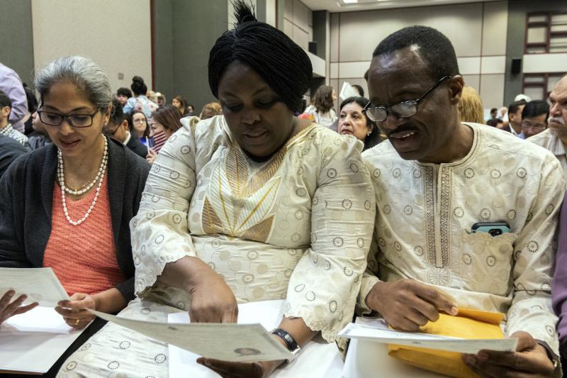 Yemesi Dorcas Abudu and Omotayo Adeniyi Abudu, both of Nigeria, look at their Certificates of Naturalization following the ceremony.